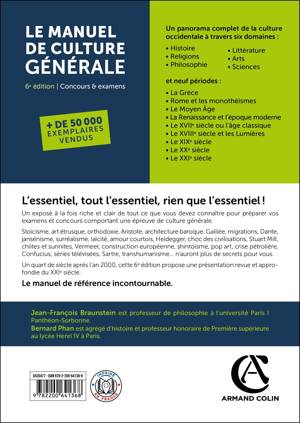 Toute la culture générale, de l'Antiquité au XXIe siècle, en 150 entrées ! Stoïcisme, art étrusque, orthodoxie, Aristote, architecture baroque, Galilée, migrations, Dante, jansénisme, surréalisme, laïcité, amour courtois, Heidegger, choc des civilisations, Stuart Mill, chiites et sunnites, Vermeer, construction européenne, shintoïsme, pop art, crise pétrolière, Confucius, séries télévisées, Sartre, transhumanisme… n’auront plus de secrets pour vous. Un panorama complet de la culture occidentale à traverssix domaines : Histoire, Religions, Philosophie, Littérature, Arts, Sciences - etneuf périodes : Grèce - Rome et les monothéismes - Moyen Âge - Renaissance et l’époque moderne - XVIIe siècle ou l’âge classique - XVIIIe siècle et les Lumières - XIXe siècle - XXe siècle - XXIe siècle. Cette 5eéd. propose une actualisation des connaissances sur le XXIe siècle. Pour cette nouvelle édition, de nouvelles rubriques viennent compléter toutes les entrées pour apporter plus de dynamisme à la lecture dans une maquette revue pour plus de clarté.