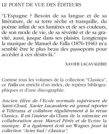 "L'Espagne ? Besoin de sa langue et de sa littérature, de sa terre sèche et tranquille, du poème infini de ses lumières et de ses couleurs, de son mode de vie, de sa sévérité et de sa gravité, aussi, jusque dans ses plaisirs. Longtemps la musique de Manuel de Falla (1876-1946) m'a semblé être le plus beau des passeports pour accéder à ces désirs-là."