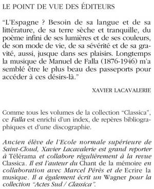 Comme tous les volumes de la collection "Classica", ce «Falla »est enrichi d'un index, de repères bibliographiques et d'une discographie.