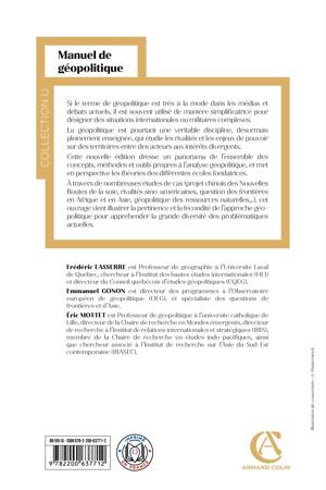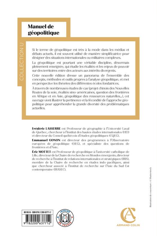Si le terme de géopolitique est très à la mode dans les médias et débats actuels, il est souvent utilisé de manière simplificatrice pour désigner des situations internationales ou militaires complexes. La géopolitique est pourtant une véritable discipline, désormais pleinement enseignée, qui étudie les rivalités et les enjeux de pouvoir sur des territoires entre des acteurs aux intérêts divergents. Cette nouvelle édition dresse un panorama de l’ensemble des concepts, méthodes et outils propres à l’analyse géopolitique, et met en perspective les théories des différentes écoles fondatrices. À travers de nombreuses études de cas (projet chinois des Nouvelles Routes de la soie, rivalités sino-américaines, question des frontières en Afrique et en Asie, géopolitique des ressources naturelles…), cet ouvrage vient illustrer la pertinence et la fécondité de l’approche géopolitique pour appréhender la grande diversité des problématiques actuelles.