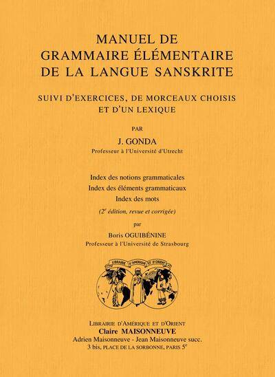 Manuel de grammaire élémentaire de la langue sanskrite, suivi d'exercices, de morceaux choisis et d'un lexique. Addenda et corrigenda, Index des notions grammaticales, Index des éléments grammaticaux, Index des mots par B. Oguibénine. Cette grammaire s'adresse aux débutants et 1ere année en sanskrit.