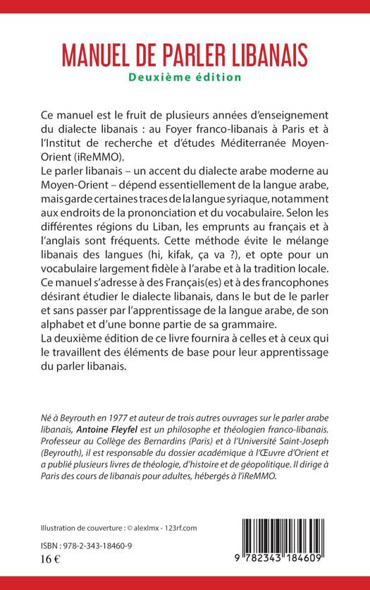 Le parler libanais - un accent du dialecte arabe moderne au Moyen-Orient - dépend essentiellement de la langue arabe, mais garde certaines traces de la langue syriaque, notamment aux endroits de la prononciation et du vocabulaire. Cette méthode opte pour un vocabulaire largement fidèle à l'arabe et à la tradition locale. Ce manuel s'adresse à des Français(es) et à des francophones désirant étudier le dialecte libanais, dans le but de le parler et sans passer par l'apprentissage de la langue arabe, de son alphabet et d'une bonne partie de sa grammaire. La deuxième édition de ce livre fournira à celles et à ceux qui le travaillent des éléments de base pour leur apprentissage du parler libanais.