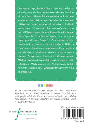 Ce manuel de poche fournit aux internes, médecins et soignants de bloc opératoire, de réanimation et de soins critiques les connaissances indispensables sur les médicaments les plus fréquemment utilisés en anesthésie et réanimation. Il décrit les notions de base en pharmacologie ainsi que les différents types de médicaments utilisés par les soignants de soins critiques dans leur pratique quotidienne. Complété d’un lexique de réanimation, il se compose de 10 chapitres :