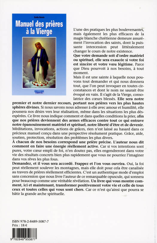 Quand et comment prier la Vierge Marie ? De quelle manière pouvons-nous obtenir son intercession ? Quelles sont les circonstances dans lesquelles son recours se révèle absolument indispensable, à l’exception de tout autre ? Quelles sont les prières les plus adaptées à sa célébration ? Apprendre à pardonner aux autres et à soi-même, se guérir des désirs malsains, trouver ou retrouver un emploi adapté à nos compétences comme à nos besoins, rencontrer son âme soeur, consolider la relation entre époux, guérir les maux du corps et de l’esprit, protéger les nourrissons, trouver un logement décent, triompher des obstacles les plus coriaces : du plus élevé au plus trivial, aucun désir, si en dépendnotre bonheur véritable, ne sera jugé dérisoire par la Mère des hommes. Aimer, comprendre, et croire, telles demeurent les clés de son intercession. Un manuel de prières que se doit de posséder tout vrai croyant car il nous ouvreles portes de la félicité. Marie, Sainte entre les saintes, sait pardonner aux êtres leur faiblesse et lit dans le coeur des hommes. La prier avec foi et sincérité peut renverser le cours de votre destinée, tant est immense son pouvoir d’intercession. Ces pages et les prières parfaitement opérationnelles qui y figurent sont entièrement consacrées à la Vierge, celle que l’on n’invoque jamais en vain.