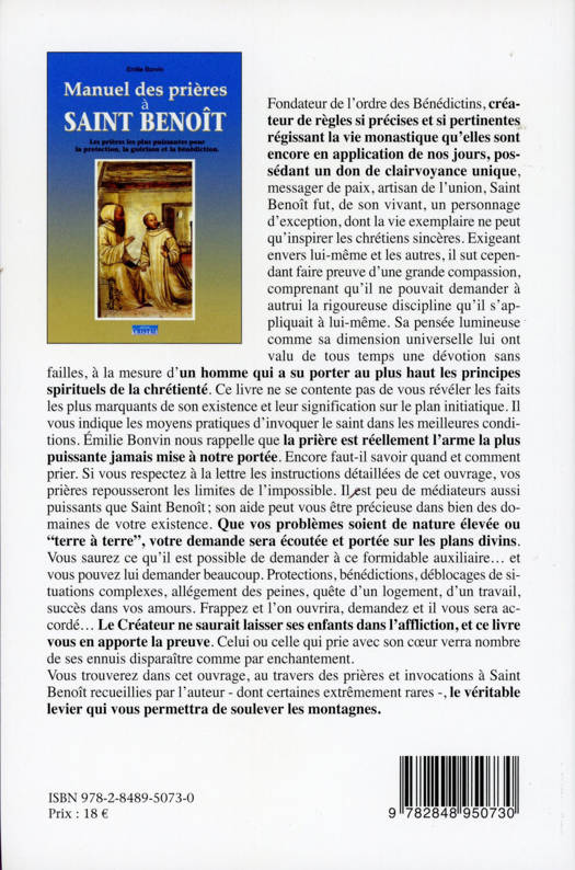 Ce livre ne se contente pas de vous révéler les faits les plus marquants de son existence et leur signification sur le plan initiatique. Il vous indique les moyens pratiques d'invoquer le saint dans les meilleures conditions. Émilie Bonvin nous rappelle que la prière est réellement l'arme la plus puissante jamais mise à notre portée. Encore faut-il savoir quand et comment prier. Si vous respectez à la lettre les instructions détaillées de cet ouvrage, vos prières repousseront les limites de l'impossible. Il est peu de médiateurs aussi puissants que Saint Benoît ; son aide peut vous être précieuse dans bien des domaines de votre existence. Que vos problèmes soient de nature élevée ou "terre à terre", votre demande sera écoutée et portée sur les plans divins. Vous saurez ce qu'il est possible de demander à ce formidable auxiliaire... et vous pouvez lui demander beaucoup. Protections, bénédictions, déblocages de situations complexes, allégement des peines, quête d'un logement, d'un travail, succès dans vos amours. Frappez et l'on ouvrira, demandez et il vous sera accordé... Le Créateur ne saurait laisser ses enfants dans l'affliction, et ce livre vous en apporte la preuve. Celui ou celle qui prie avec son cœur verra nombre de ses ennuis disparaître comme par enchantement. Vous trouverez dans cet ouvrage, au travers des prières et invocations à Saint Benoît recueillies par l'auteur - dont certaines extrêmement rares -, le véritable levier qui vous permettra de soulever les montagnes.