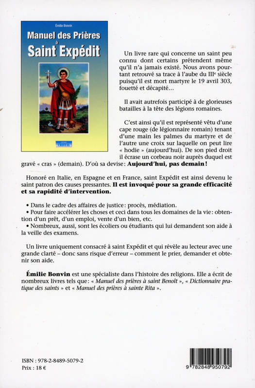 Un livre rare qui concerne un saint peu connu dont certains prétendent même qu'il n'a jamais existé. Nous avons pourtant retrouvé sa trace à l'aube du IIIe siècle puisqu'il est mort martyre le 19 avril 303, fouetté et décapité... Il avait autrefois participé à de glorieuses batailles à la tête des légions romaines. C'est ainsi qu'il est représenté vêtu d'une cape rouge (de légionnaire romain) tenant d'une main les palmes du martyre et de l'autre une croix sur laquelle on peut lire «hodie» (aujourd'hui). De son pied droit il écrase un corbeau noir auprès duquel est gravé «cras» (demain). D'où sa devise : Aujourd'hui, pas demain ! Honoré en Italie, en Espagne et en France, saint Expédit est ainsi devenu le saint patron des causes pressantes. Il est invoqué pour sa grande efficacité et sa rapidité d'intervention. Dans le cadre des affaires de justice : procès, médiation. Pour faire accélérer les choses et ceci dans tous les domaines de la vie : obtention d'un prêt, d'un emploi, vente d'un bien, etc. Nombreux, aussi, sont les écoliers ou étudiants qui lui demandent son aide à la veille des examens. Un livre uniquement consacré à saint Expédit et qui révèle au lecteur avec une grande clarté - donc sans risque d'erreur - comment le prier, demander et obtenir son aide.