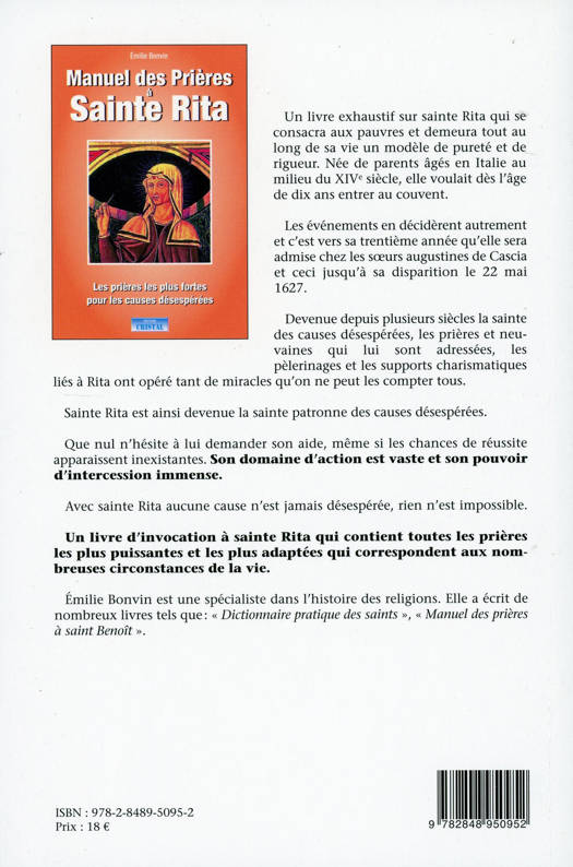Prier sainte Rita, c’est choisir un moment privilégié de la journée ou de la nuit, peu importe, pour lui adresser, de tout notre coeur, une demande particulière. À tous ceux qui souffrent, pleurent et désespèrent, sainte Rita répond toujours positivement pourvu que l’on s’adresse à elle avec toute la ferveur de notre coeur. L’auteur a tenu à commencer son livre par “SOS à sainte Rita”, une prière d’urgence destinée à ceux “qui n’en peuvent plus”, que la douleur ou la vie accablent et qui sont sur le point de lâcher prise. Cette prière très ancienne, aux mots simples, sans fioriture, est un véritable appel au secours adressé à la Sainte. Il ne faut pas hésiter à se confier à elle ! Il faut tout lui dire avec confiance et sincérité. Petit à petit, par la force de la prière, on se trouvera d’abord en mesure d’affronter ce qui, parfois, semble près de nous terrasser. On trouvera une énergie neuve. On avancera.