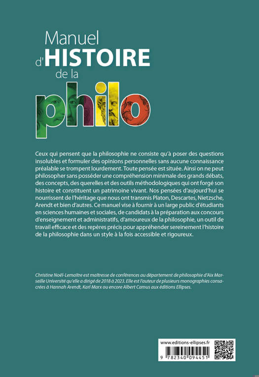 Ceux qui pensent que la philosophie ne consiste qu'à poser des questions insolubles et formuler des opinions personnelles sans aucune connaissance préalable se trompent lourdement. Toute pensée est située. Ainsi on ne peut philosopher sans posséder une compréhension minimale des grands débats, des concepts, des querelles et des outils méthodologiques qui ont forgé son histoire et constituent un patrimoine vivant. Nos pensées d'aujourd'hui se nourrissent de l'héritage que nous ont transmis Platon, Descartes, Nietzsche, Arendt et bien d'autres. Ce manuel vise à fournir à un large public d'étudiants en sciences humaines et sociales, de candidats à la préparation aux concours d'enseignement et administratifs, d'amoureux de la philosophie, un outil de travail efficace et des repères précis pour appréhender sereinement l'histoire de la philosophie dans un style à la fois accessible et rigoureux.