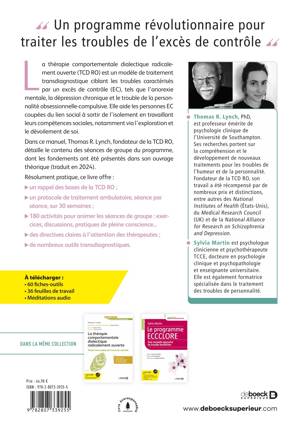 Dans ce manuel, Thomas R. Lynch, fondateur de la TCD RO, détaille le contenu des séances de groupe du programme, dont les fondements ont été présentés dans son ouvrage théorique (traduit chez De Boeck Supérieur en 2024).