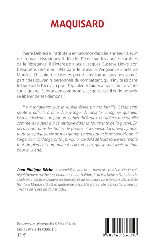 Pierre Debresse, instituteur en province dans les années 70, écrit des romans historiques. Il décide d'écrire sur les années sombres de la Résistance. Il s'intéresse alors à Jacques Gustave Lièvre, son beau-père, rentré en 1943 dans le réseau Vengeance près de Moulins. L'histoire de Jacques prend ainsi forme sous nos yeux à partir des souvenirs personnels du combattant, qui s'invite ici dans le bureau de l'écrivain pour l'épauler et l'aider à transcrire sa vérité sur la guerre. Sans aucun compromis. Jacques va-t-il enfin pouvoir se libérer de ses démons ? Il y a longtemps que je voulais écrire sur ma famille. C'était sans doute si difficile à faire. À envisager. À raconter. Imaginer que leur histoire devienne un jour un objet théâtral . L'histoire d'une famille comme les autres qui se retrouve dans la tourmente de la guerre. En découvrant dans les boîtes de photos et les vieux documents jaunis, toute une page de vie de mes grands-parents, dont je ne connaissais ni l'urgence ni la dangerosité, j'ai voulu, au-delà de leurs souvenirs, rendre tout simplement hommage à celles et ceux qui se sont levés un jour pour la liberté.