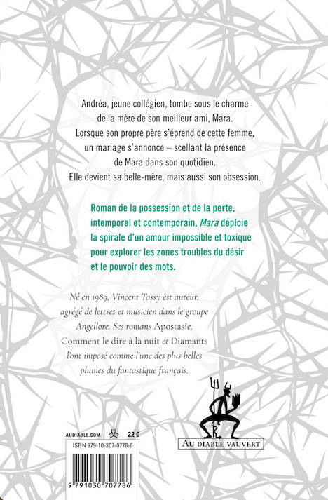Andréa, jeune collégien, tombe sous le charme de la mère de son meilleur ami, Mara. Lorsque son propre père s'éprend de cette femme, un mariage s'annonce ¿ scellant la présence de Mara dans son quotidien. Elle devient sa bellemère, mais aussi son obsession. Roman de la possession et de la perte, intemporel et contemporain, Mara déploie la spirale d'un amour impossible et toxique pour explorer les zones troubles du désir et le pouvoir des mots. Né en 1989, Vincent Tassy est auteur, agrégé de lettres et musicien dans le groupe Angellore. Ses romans Apostasie, Comment le dire à la nuit et Diamants l'ont imposé comme l'une des plus belles plumes du fantastique français.