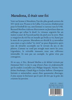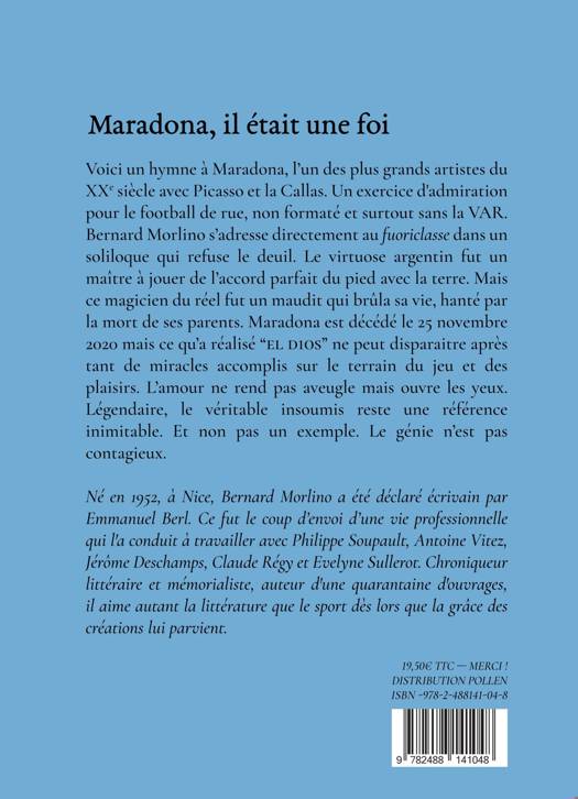 Il faut neuf mois pour faire un vivant mais combien de temps pour faire un disparu ? Voici un hymne à la « matchographie », à la « butographie » de Maradona, l’un des plus grands artistes du XXe siècle avec Picasso et la Callas. Un exercice d'admiration pour le football de rue, non formaté et surtout sans vidéo surveillance. Bernard Morlino s’adresse au fuoriclasse (surdoué) dans un soliloque qui refuse le deuil : la littérature sert à raconter l’impossible. Le virtuose argentin -drogué et non pas dopé- fut un authentique maître à jouer de l’accord parfait du pied avec la terre. Un maestro de l’instant, magicien du réel. Au lieu de vivre sur sa renommée planétaire, le créateur fut un maudit qui brûla sa vie, hanté par la disparition de ses parents qu’il aurait toujours voulu garder auprès de lui. Maradona est mort le 25 novembre 2020 mais ce qu’a réalisé « El D10S » ne peut pas disparaître, surtout après tant de miracles accomplis sur le terrain du jeu et des plaisirs. Légendaire, le véritable insoumis reste une référence inimitable, et non pas un exemple. Le génie n’est pas contagieux. L’amour pour Maradona ne rend pas aveugle : il nous ouvre les yeux.