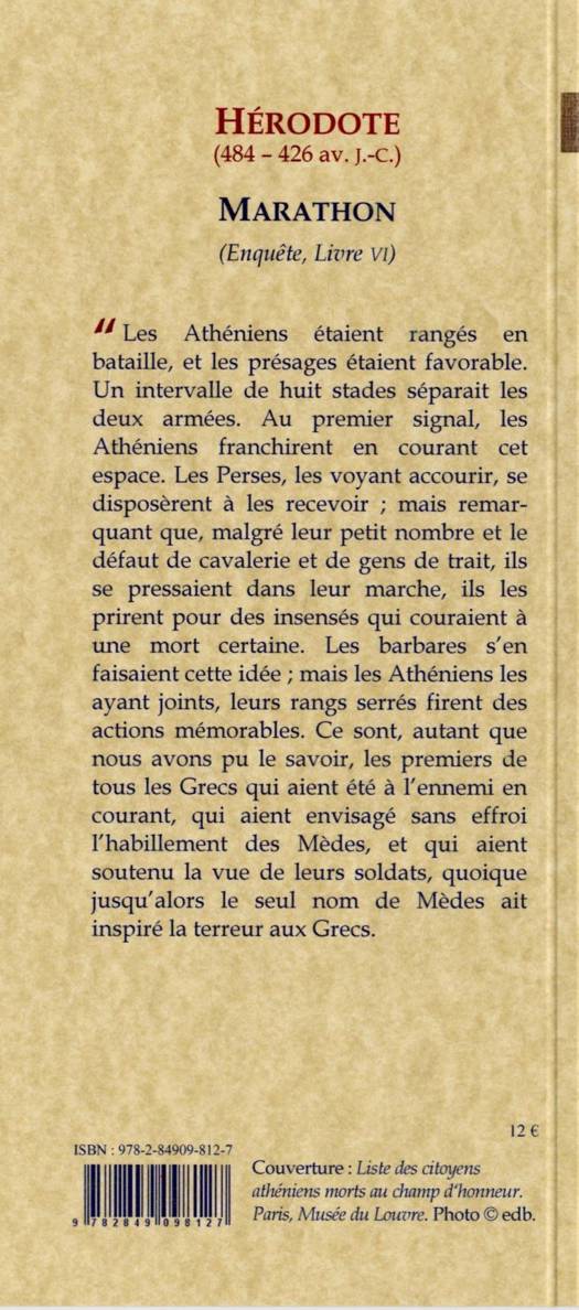 « Les Athéniens étaient rangés en bataille, et les présages étaient favorable. Un intervalle de huit stades séparait les deux armées. Au premier signal, les Athéniens franchirent en courant cet espace. Les Perses, les voyant accourir, se disposèrent à les recevoir ; mais remarquant que, malgré leur petit nombre et le défaut de cavalerie et de gens de trait, ils se pressaient dans leur marche, ils les prirent pour des insensés qui couraient à une mort certaine. Les barbares s'en faisaient cette idée ; mais les Athéniens les ayant joints, leurs rangs serrés firent des actions mémorables. Ce sont, autant que nous avons pu le savoir, les premiers de tous les Grecs qui aient été à l'ennemi en courant, qui aient envisagé sans effroi l'habillement des Mèdes, et qui aient soutenu la vue de leurs soldats, quoique jusqu'alors le seul nom de Mèdes ait inspiré la terreur aux Grecs.