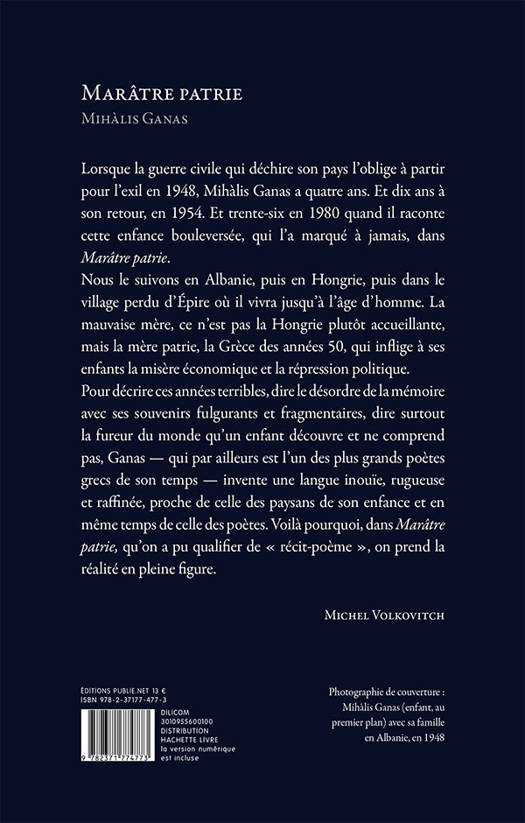 Lorsque la guerre civile qui de chire son pays l’oblige a partir pour l’exil en 1948, Miha lis Ganas a quatre ans. Et dix ans a son retour, en 1954. Et trente-six en 1980 quand il raconte cette enfance bouleverse e, qui l’a marque a jamais, dans Mara tre patrie. Nous le suivons en Albanie, puis en Hongrie, puis dans le village perdu d’E pire ou il vivra jusqu’a l’a ge d’homme. La mauvaise me re, ce n’est pas la Hongrie pluto t accueillante, mais la me re patrie, la Gre ce des anne es 50, qui inflige a ses enfants la mise re e conomique et la re pression politique. Pour de crire ces anne es terribles, dire le de sordre de la me moire avec ses souvenirs fulgurants et fragmentaires, dire surtout la fureur du monde qu’un enfant de couvre et ne comprend pas, Ganas — qui par ailleurs est l’un des plus grands poe tes grecs de son temps — invente une langue inoui e, rugueuse et raffine e, proche de celle des paysans de son enfance et en me me temps de celle des poe tes. Voila pourquoi, dans Mara tre patrie, qu’on a pu qualifier de « re cit-poe me », on prend la re alite en pleine figure.