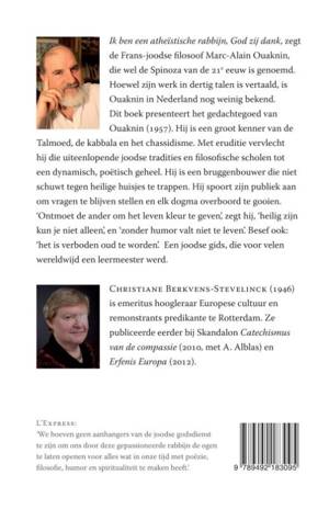 Ik ben een atheïstische rabbijn, God zij dank, zegt de Frans-joodse filosoof Marc-Alain Ouaknin (spreek uit: waknien), die wel de Spinoza van de 21e eeuw is genoemd. Hoewel zijn werk in dertig talen is vertaald, is Ouaknin in Nederland nog weinig bekend. Dit boek presenteert in kort bestek het gedachtegoed van Ouaknin (1957). Hij is een groot kenner van de Talmoed, de kabbala en het chassidisme. Met eruditie vervlecht hij die uiteenlopende joodse tradities en filosofische scholen tot een dynamisch, poëtisch geheel. Hij is een bruggenbouwer die niet schuwt heilige huisjes in te trappen. Hij spoort zijn publiek aan om vragen te blijven stellen en elk dogma overboord te gooien. 'Ontmoet de ander om het leven kleur te geven', zegt hij, 'heilig zijn kun je niet alleen', 'zonder humor valt er niet te leven' en besef vooral: 'het is verboden oud te worden'. Een joodse gids, die voor velen wereldwijd een leermeester werd.