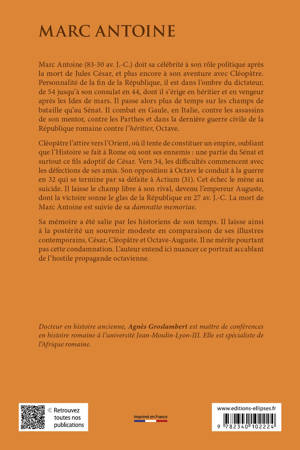 Marc Antoine (83-30 av. J.-C.) doit sa célébrité à son rôle politique après la mort de Jules César, et plus encore à son aventure avec Cléopâtre. Personnalité de la fin de la République, il est dans l’ombre du dictateur, de 54 jusqu’à son consulat en 44, dont il s’érige en héritier et en vengeur après les Ides de mars. Il passe alors plus de temps sur les champs de bataille qu’au Sénat. Il combat en Gaule, en Italie, contre les assassins de son mentor, contre les Parthes et dans la dernière guerre civile de la République romaine contre l’héritier, Octave.