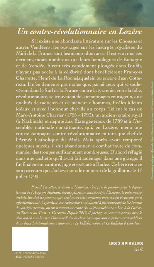 S’il existe une abondante littérature sur les Chouans et autres Vendéens, les ouvrages sur les insurgés royalistes du Midi de la France sont beaucoup plus rares. Il est vrai que ces derniers, moins nombreux que leurs homologues de Bretagne et de Vendée, furent très rapidement plongés dans l’oubli, n’ayant pas accès à la célébrité dont bénéficièrent François Charrette, Henri de La Rochejaquelein ou encore Jean Cottereau. Il n’en demeure pas moins que, parmi ceux qui se soulevèrent dans le Sud de la France contre la tyrannie, voire la folie, révolutionnaire, se trouvaient des personnages courageux, aux qualités de tacticien et de meneur d’hommes, fidèles à leurs idéaux et avec l’honneur chevillé au corps. Tel fut le cas de Marc-Antoine Charrier (1755 – 1793), un ancien notaire royal (à Nasbinals) et député aux États généraux de 1789 et à l’Assemblée nationale constituante qui, en Lozère, mena une courte campagne contre révolutionnaire en tant que chef de l’Armée Catholique du Midi. Mais après avoir remporté quelques succès, il dut abandonner le combat faute de commander des troupes suffisamment nombreuses. D’abord réfugié dans une cachette qu’il avait fait aménager dans une grange, il fut finalement capturé, jugé et exécuté à Rodez. Ce livre retrace son parcours qui s’acheva sous le couperet de la guillotine le 17 juillet 1793.