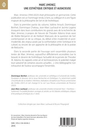 Marc Jimenez (1943-2023) était philosophe et germaniste. Cette publication est un hommage rendu à l'ami, au collègue et à une figure majeure de la philosophie de l'art et de l'esthétique. Dans la première partie du volume, Valérie Arrault, Dominique Berthet, Dominique Chateau, Jean-Marc Lachaud et Jacinto Lageira évoquent dans leurs contributions les grands axes de la recherche de Marc Jimenez, à propos de l'oeuvre de Theodor Adorno (mais aussi de Walter Benjamin et de Herbert Marcuse), de la question de l'art contemporain et de sa critique, du débat entre modernité et post-modernité, des enjeux posés par la confrontation entre l'artistique et le culturel, ou encore de son approche de la philosophie et de la poésie de Nietzsche. Dans la seconde partie sont rassemblés plusieurs textes de Marc Jimenez (sur la beauté, le devenir de l'esthétique, l'actualité de la pensée de Theodor W. Adorno, les rapports entre art et technosciences, le potentiel malgré tout subversif de certaines oeuvres actuelles...).