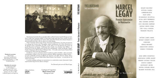 Sont ici réunis, riche fonds d'une exposition à venir en septembre 2025 au Musée de Meung-sur-Loire, plus d’une centaine de pièces montrant la place prépondérante du compositeur-chansonnier Marcel Legay (1851-1915) dans l’histoire de la chanson française et en particulier l'âge d'or des cabarets artistiques de la Belle Époque, car prolongeant son rayonnement, près de 120 artistes l'ont chanté. On découvre des oeuvres de prestigieux illustrateurs et des textes de grands auteurs contemporains, le jeune Maurice Ravel et les Mimi Pinson de Gustave Charpentier. De nombreuses archives familiales y restituent l’atmosphère créative bouillonnante de la Butte Montmartre et du Quartier latin à cette époque charnière. Un ouvrage de référence et de plaisir incontournable pour découvrir les racines montmartoises de la chanson contemporaine et le compositeur de Gaston Couté, grand poète libertaire enfin reconnu, qui a inspiré Georges Brassens."Présenté pour la première fois en septembre 2025, au Musée Gaston Couté de Meung-sur-Loire, dans le cadre d’une exposition dédiée, le Fonds Marcel Legay réunit plus d’une centaine de pièces montrant la place prépondérante de l'artiste (1851-1915) dans l’histoire de la chanson française et plus particulièrement dans celle des cabarets de la Belle Époque. Visiter l’exposition Marcel Legay, Premier chansonnier de Montmartre, c’est suivre son parcours et se plonger par là même dans l’atmosphère créative bouillonnante de la Butte Montmartre et du Quartier Latin à l’articulation des XIXe et XXe siècles. C’est aussi découvrir des oeuvres de grands illustrateurs de l’époque : Heidbrinck, Ibels, Léandre, Luce, Steinlen, Uzès, Willette... et rencontrer les textes de grands auteurs qui lui sont contemporains : Auriol, de Banville, Coppée, Daudet, Maupassant, Mistral, Renan, Richepin, Zola... C’est enfin croiser le jeune Maurice Ravel et découvrir les Mimi Pinson de Charpentier. Au-delà de ces oeuvres, le Fonds est riche de nombreuses archives familiales : objets personnels, correspondance, albums et livres de chansons, partitions, affiches, programmes, disques anciens... Un poste multimédia permettra la diffusion de chansons et de vidéos. Brassens, Damia, Piaf et Patachou bien sûr, mais aussi, Mathé Altéry, Marcel Amont, Cora Vaucaire... au total, près de 120 artistes l'ont chanté. Le présent catalogue prolonge son rayonnement et sa consécration comme chansonnier le plus représentatif de l’âge d’or des cabarets artistiques."