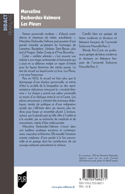 Cette « oubliée admirée » s'est souvent vue réduite à une image sentimentale et larmoyante qui a joué en sa défaveur malgré un regain d'intérêt pour les figures féminines des siècles passés. Le titre du recueil sur lequel porte ce livre, Les Pleurs, y est pour beaucoup.