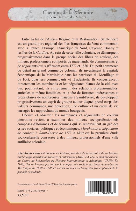 Décrire et observer les marchands et négociants de couleur pierrotins revient à examiner des milieux socioprofessionnels composés d'hommes et de femmes qui se renouvellent au gré des crises sociales, politiques et économiques. Marchands et négociants de couleur à Saint-Pierre de 1777 à 1830 est la première étude socioculturelle consacrée à des milieux professionnels d'une ville antillaise coloniale.