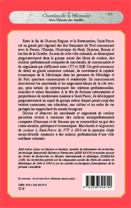 Décrire et observer les marchands et négociants de couleur pierrotins revient à examiner des milieux socioprofessionnels composés d'hommes et de femmes qui se renouvellent au gré des crises sociales, politiques et économiques. Marchands et négociants de couleur à Saint-Pierre de 1777 à 1830 est la première étude socioculturelle consacrée à des milieux professionnels d'une ville antillaise coloniale.