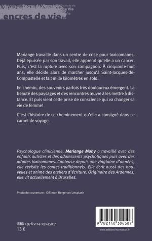 Mariange travaille dans un centre de crise pour toxicomanes. Déjà épuisée par son travail, elle apprend qu'elle a un cancer. Puis, c'est la rupture avec son compagnon. À cinquante-huit ans, elle décide alors de marcher jusqu'à Saint-Jacques-de- Compostelle et fait mille kilomètres en solo. En chemin, des souvenirs parfois très douloureux émergent. La beauté des paysages et des rencontres oeuvre à les mettre à distance. Et puis vient cette prise de conscience qui va changer sa vie de femme! C'est l'histoire de ce cheminement qu'elle a consigné dans ce carnet de voyage. Psychologue clinicienne, Mariange Mahy a travaillé avec des enfants autistes et des adolescents psychotiques puis avec des adultes toxicomanes. Conteuse depuis une vingtaine d'années, elle revisite les contes traditionnels. Elle écrit aussi des nouvelles et anime des ateliers d'écriture. Originaire des Ardennes, elle vit actuellement à Bruxelles. Photo de couverture: (c)Simon Berger on Unsplash