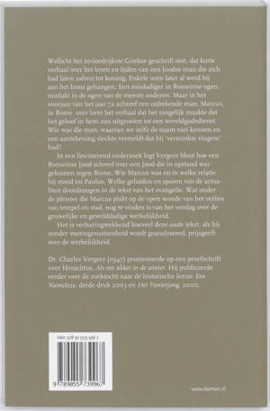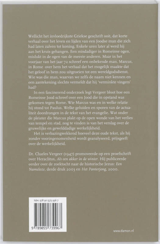 Wellicht het invloedrijkste Griekse geschrift ooit, dat korte verhaal over het leven en lijden van een Joodse man die zich had laten zalven tot koning. Enkele uren later al werd hij aan het kruis gehangen. Een misdadiger in Romeinse ogen, mislukt in de ogen van de meeste anderen. Maar in het voorjaar van het jaar 72 schreef een onbekende man, Marcus, in Rome over hem het verhaal dat het mogelijk maakte dat het geloof in hem zou uitgroeien tot een wereldgodsdienst. Wie was die man, waarvan we zelfs de naam niet kennen en een aantekening slechts vermeldt dat hij 'verminkte vingers' had? In een fascinerend onderzoek legt Vergeer bloot hoe een Romeinse Jood schreef over een Jood die in opstand was gekomen tegen Rome. Wie Marcus was en in welke relatie hij stond tot Paulus. Welke geluiden en sporen van de actualiteit doordrongen in de tekst van het evangelie. Wat onder de pleister die Marcus plakt op de open wonde van het verlies van tempel en stad, nog te vinden is van het verslag over de gruwelijke en gewelddadige werkelijkheid. Het is verbazingwekkend hoeveel deze oude tekst, als hij zonder vooringenomenheid wordt geanalyseerd, prijsgeeft over de werkelijkheid.