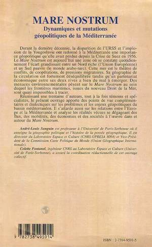 Durant la dernière décennie, la disparition de l'URSS et l'implosion de la Yougoslavie ont redonné à la Méditerranée une importance géopolitique qu'elle avait perdue depuis la Crise de Suez en 1956. Le Mare Nostrum est aujourd'hui une zone où se constate quotidiennement l'écart grandissant entre un Nord riche (l'Union Européenne) et un Sud pauvre (le monde arabo-turc). Cet ouvrage apporte des points de vue complémentaires et dialectiques sur les problèmes et les enjeux géopolitiques du bassin méditerranéen.
