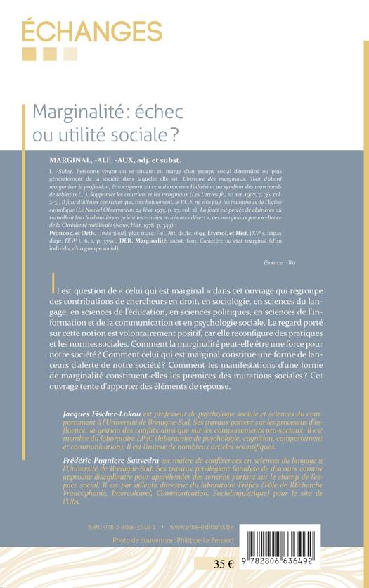 Il est question de " celui qui est marginal " dans cet ouvrage qui regroupe des contributions de chercheurs en sciences humaines et sociales. Le regard porté sur cette notion est volontairement positif car elle reconfigure des pratiques et les normes sociales. Comment la marginalité peut-elle être une force pour notre société ? Comment les manifestations d'une forme de marginalité constituent-elles les prémices des mutations sociales ?