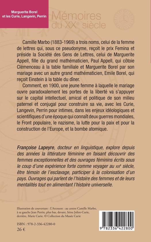 Camille Marbo (1883-1969) a trois noms, celui de la femme de lettres qui, sous ce pseudonyme, reçoit le prix Femina et préside la Société des Gens de Lettres, celui de Marguerite Appell, fille du grand mathématicien, Paul Appell, qui côtoie Clémenceau à la table familiale et Marguerite Borel par son mariage avec un autre grand mathématicien, Emile Borel, qui reçoit Einstein à la table du dîner. Comment, en 1900, une jeune femme à laquelle le mariage ouvre paradoxalement les portes de la liberté va s'appuyer sur le capital intellectuel, amical et politique de son milieu paternel et conjugal pour construire sa vie, avec les Curie, Langevin, Perrin pour intimes, dans les enjeux idéologiques et scientifiques d'une époque qui connaît deux guerres mondiales, le Front populaire, le nazisme, la lutte pour la paix et pour la construction de l'Europe, et la bombe atomique.