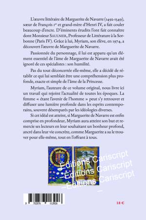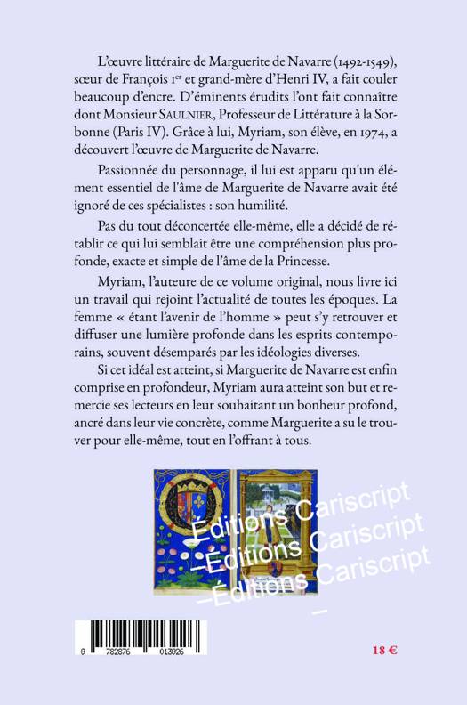 L’œuvre littéraire de Marguerite de Navarre (1492-1549), sœur de François 1 er et grand-mère d’Henri IV, a fait couler beaucoup d’encre. D’éminents érudits l’ont fait connaître dont Monsieur S AULNIER, Professeur de Littérature à la Sorbonne (Paris IV). Grâce à lui, Myriam, son élève, en 1974, a découvert l’œuvre de Marguerite de Navarre. Passionnée du personnage, il lui est apparu qu'un élément essentiel de l'âme de Marguerite de Navarre avait été ignoré de ces spécialistes : son humilité. Pas du tout déconcertée elle-même, elle a décidé de rétablir ce qui lui semblait être une compréhension plus profonde, exacte et simple de l’âme de la Princesse. Myriam, l’auteure de ce volume original, nous livre ici un travail qui rejoint l’actualité de toutes les époques. La femme « étant l’avenir de l’homme » peut s’y retrouver et difffuser une lumière profonde dans les esprits contemporains, souvent désemparés par les idéologies diverses. Si cet idéal est atteint, si Marguerite de Navarre est enfiin comprise en profondeur, Myriam aura atteint son but et remercie ses lecteurs en leur souhaitant un bonheur profond, ancré dans leur vie concrète, comme Marguerite a su le trouver pour elle-même, tout en l’offfrant à tous.