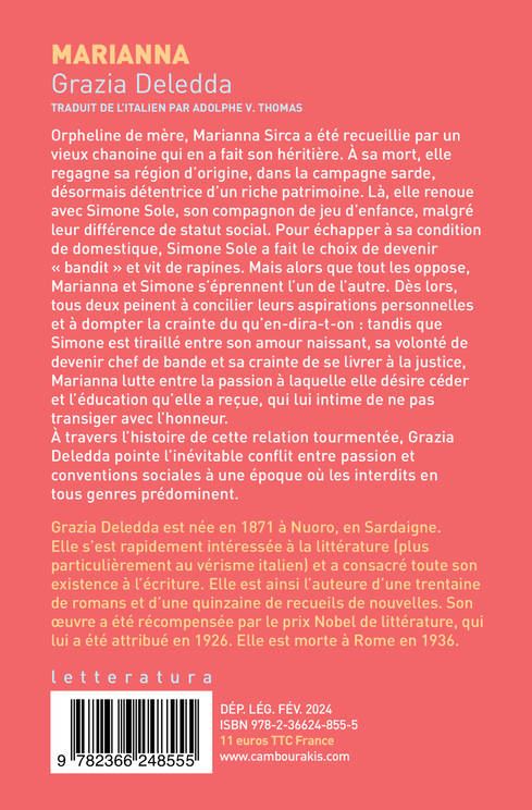 Orpheline de mère, Marianna Sirca a été recueillie par un vieux chanoine qui en a fait son héritière. À sa mort, elle regagne sa région d'origine, dans la campagne sarde, désormais détentrice d'un riche patrimoine. Là, elle renoue avec Simone Sole, son compagnon de jeu d'enfance, malgré leur différence de statut social. Pour échapper à sa condition de domestique, Simone Sole a fait le choix de devenir « bandit » et vit de rapines. Mais alors que tout les oppose, Marianna et Simone s'éprennent l'un de l'autre. Dès lors, tous deux peinent à concilier leurs aspirations personnelles et à dompter la crainte du qu'en-dira-t-on : tandis que Simone est tiraillé entre son amour naissant, sa volonté de devenir chef de bande et sa crainte de se livrer à la justice, Marianna lutte entre la passion à laquelle elle désire céder et l'éducation qu'elle a reçue, qui lui intime de ne pas transiger avec l'honneur. À travers l'histoire de cette relation tourmentée, Grazia Deledda pointe l'inévitable conflit entre passion et conventions sociales à une époque où les interdits en tous genres prédominent.