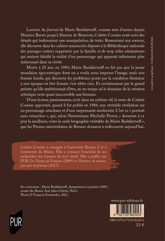 D'une lecture passionnante, écrit dans un rythme vif, le texte de Colette Cosnier apportait, quand il fut publié en 1984, une véritable révélation sur un personnage attachant et d'une surprenante modernité. C'est ce « portrait sans retouches », qui, selon l'historienne Michelle Perrot, « demeure à ce jour la meilleure, voire la seule biographie véritable de Marie Bashkirtseff », que les Presses universitaires de Rennes donnent à redécouvrir aujourd'hui.