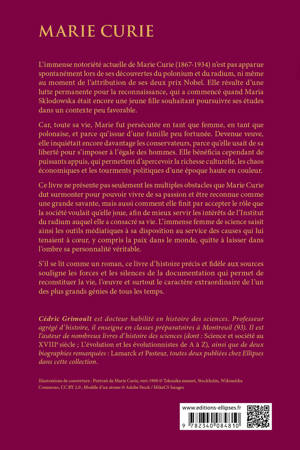 Ce livre ne présente pas seulement les multiples obstacles que Marie Curie dut surmonter pour pouvoir vivre de sa passion et être reconnue comme une grande savante, mais aussi comment elle finit par accepter le rôle que la société voulait qu’elle joue, afin de mieux servir les intérêts de l’Institut du radium auquel elle a consacré sa vie. L’immense femme de science saisit ainsi les outils médiatiques à sa disposition au service des causes qui lui tenaient à cœur, y compris la paix dans le monde, quitte à laisser dans l’ombre sa personnalité véritable.