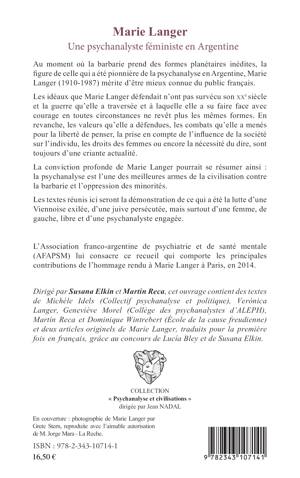 Au moment où la barbarie prend des formes planétaires inédites, la figure de celle qui a été pionnière de la psychanalyse en Argentine, Marie Langer (1910-1987) mérite d'être mieux connue du public français. Les valeurs qu'elle a défendues, les combats qu'elle a menés pour la liberté, la prise en compte de l'influence de la société sur l'individu, les droits des femmes ou encore la nécessité du dire, sont toujours d'une criante actualité. La conviction profonde de Marie Langer pourrait se résumer ainsi : la psychanalyse est l'une des meilleures armes de la civilisation contre la barbarie et l'oppression des minorités.