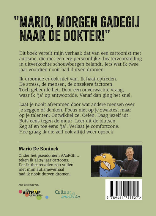 In “Mario, morgen gadegij naar de dokter!”, naar de gelijknamige titel van de theatervoorstelling over zijn autisme, vertelt Mario De Koninck (AAaRGh...) over de totstandkoming van deze voorstelling: van het prilste begin met try-outs in woonkamers tot optredens in uitverkochte culturele centra. Over hoe iemand met autisme, voor wie structuur, duidelijkheid en niet te veel prikkels belangrijk zijn, tot zijn eigen verbazing in uitverkochte culturele centra belandt.