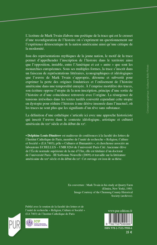 L’écriture de Mark Twain élabore une poétique de la trace qui est le creuset d’une reconfiguration de l’histoire où s’expriment un questionnement sur l’expérience démocratique de la nation américaine ainsi qu’une critique de la modernité. Issu des représentations mythiques de la jeune nation, le motif de la trace permet d’appréhender l’inscription de l’histoire dans le territoire ainsi que l’opposition, instable, entre l’Amérique et cet « autre » que sont les monarchies européennes. Sous ses multiples formes, la trace s’inscrit dans un faisceau de représentations littéraires, iconographiques et idéologiques que l’oeuvre de Mark Twain s’approprie, détourne et subvertit pour exprimer la perte des origines fondatrices et l’enlisement de l’histoire américaine dans une temporalité enrayée. À l’emprise mortifère des traces, son écriture oppose l’utopie de la non-inscription, principe d’une sortie de l’histoire et d’une coïncidence retrouvée avec l’origine. La résurgence de tensions irrésolues dans les textes tardifs convertit cependant cette utopie en dystopie pour réduire l’histoire à une dérive insensée dans l’inactuel, où les traces ne sont plus que les signifiants d’un rêve sans substance. La définition d’une esthétique s’articule ici avec une approche historiciste qui inscrit l’oeuvre dans le contexte idéologique, artistique et culturel américain du XIXe siècle et du début du XXe.