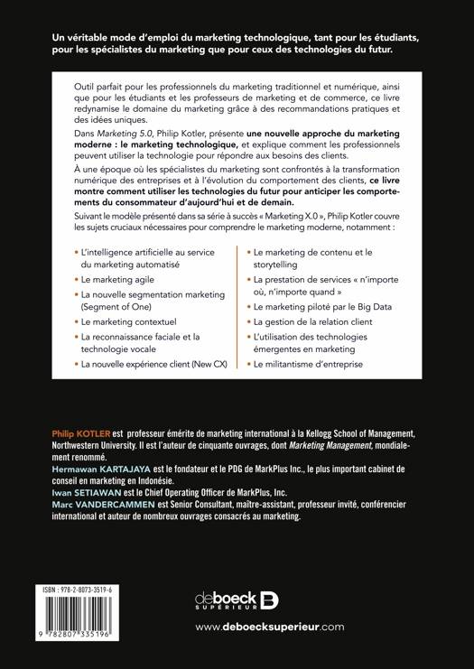 Dans Marketing 5.0, Philip Kotler, présente une nouvelle approche du marketing moderne : le "marketing technologique", et explique comment les spécialistes du marketing peuvent utiliser la technologie pour répondre aux besoins des clients.