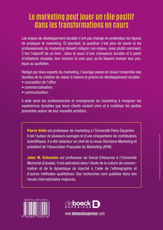 Les enjeux de développement durable n’ont pas changé en profondeur les façons de pratiquer le marketing. Et pourtant, la question n’est plus de savoir si les professionnels du marketing doivent intégrer ces enjeux, mais plutôt comment. C’est l’objectif de ce livre : dans le souci d’une croissance durable et à parti d’initiatives réussies, leur montrer la voie pour qu’ils fassent évoluer leur pratique au quotidien.