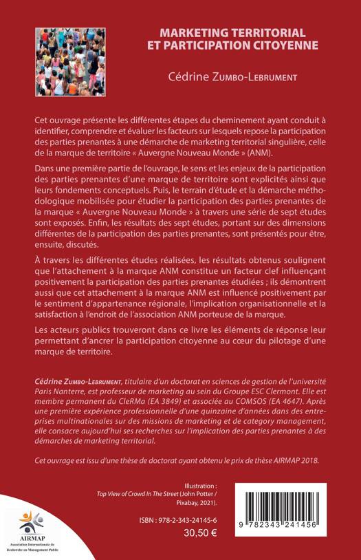 Cet ouvrage présente les différentes étapes du cheminement ayant conduit à identifier, comprendre et évaluer les facteurs sur lesquels repose la participation des parties prenantes à une démarche de marketing territorial singulière : celle de la marque de territoire « Auvergne Nouveau Monde » (ANM). Dans une première partie, le sens et les enjeux de la participation des parties prenantes d’une marque de territoire sont explicités ainsi que leurs fondements conceptuels. Puis, le terrain d’étude et la démarche méthodologique mobilisée. Enfin, les résultats de sept études, portant sur des dimensions différentes de la participation des parties prenantes, sont présentés pour être discutés. À travers ces études, les résultats obtenus soulignent que l’attachement à la marque ANM constitue un facteur clef influençant positivement la participation des parties prenantes ; ils démontrent que cet attachement est influencé positivement par le sentiment d’appartenance régionale, l’implication organisationnelle et la satisfaction à l’endroit de l’association ANM porteuse de la marque. Les acteurs publics trouveront dans ce livre des éléments pour ancrer la participation citoyenne au coeur du pilotage d’une marque de territoire.