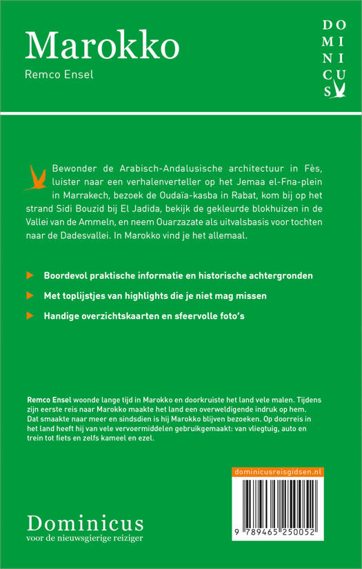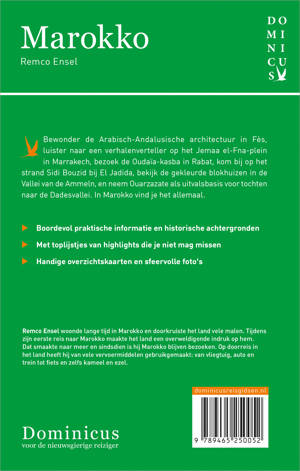 Ontdek Marokko op vakantie met deze Dominicus-reisgids en verken de bijzondere Arabisch-Andalusische architectuur in Fès, luister naar een verhalenverteller op het Jemaa el-Fna-plein in Marrakech en bezoek de wijk Oudaïakasba in Rabat. Kom bij op het strand Sidi Bouzid bij El Jadida, bekijk de gekleurde blokhuizen in de Vallei van de Ammeln en gebruik Ouarzazate als uitvalsbasis voor tochten naar de Dadesvallei. Beleef de ultieme vakantie in Marokko. Deze reisgids staat bomvol praktische informatie, handige overzichtskaarten, sfeervolle foto's, historische achtergronden en uitgebreide culturele achtergrondinformatie. Bovendien zijn Dominicus-reisgidsen altijd up-to-date en geschreven door Nederlandstalige experts.