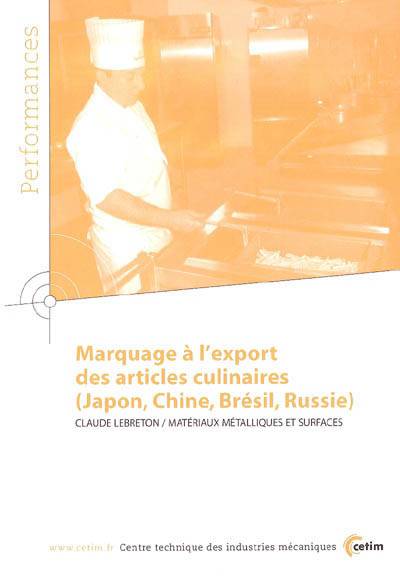 Résume les informations collectées sur les exigences de marquage des articles culinaires au Japon, en Chine, au Brésil et en Russie, à l'intention des fabricants, afin de leur faciliter l'exportation. Les articles concernés sont les poêles, les sauteuses, les casseroles, les faitouts, les cocottes, les moules à gâteaux, la coutellerie, les couverts, etc.