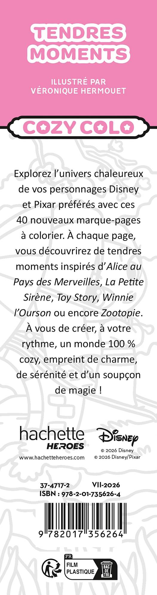 Explorez l’univers chaleureux de vos personnages Disney et Pixar préférés avec ces 40 nouveaux marque-pages à colorier. À chaque page, vous découvrirez de tendres moments inspirés d’Alice au Pays des Merveilles, La Petite Sirène, Toy Story, Winnie l’Ourson ou encore Zootopie.