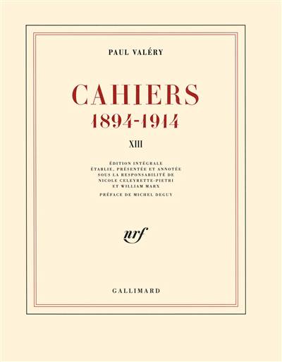 Avec ce volume qui va de mars 1914 à janvier 1915, treizième et dernier tome, s'achève l'édition scientifique des Cahiers 1894-1914 de Valéry. On retrouve là ce qui fait le mouvement profond des Cahiers : une mise à distance de soi qui permet à Valéry de critiquer toutes les croyances et toutes les illusions afin de mieux interroger le fonctionnement de l'esprit. Le texte, passionnant de bout en bout, questionne ainsi l'intelligence, le langage, la musique, le hasard, le rêve, la sensibilité, en des séquences thématiques qui vont de l'aphorisme au petit traité psychologique quasi autonome. De façon stupéfiante, ces derniers cahiers mettent en évidence le retentissement de la Première Guerre mondiale sur le psychisme de Valéry : on y voit le thème et les mots mêmes des premiers vers de La Jeune Parque y sortir tout entiers du choc de la déclaration de guerre. En annexe du volume, Nicole Celeyrette-Pietri propose une synthèse capitale de l'histoire des Cahiers et en montre l'importance pour Valéry : c'était pour lui son oeuvre majeure, à la publication de laquelle il n'a cessé de songer (mais sous quelle forme ?), et dont il a tiré notamment le matériau de Tel Quel, de Moralités et du Cahier B 1910. Afin d'éclairer la matière et la poétique des Cahiers, la préface de Michel Deguy réfléchit sur la poésie, mais aussi sur le monde contemporain, en posant la question cruciale : s'il revenait dans ce monde, qu'en penserait Valéry ?