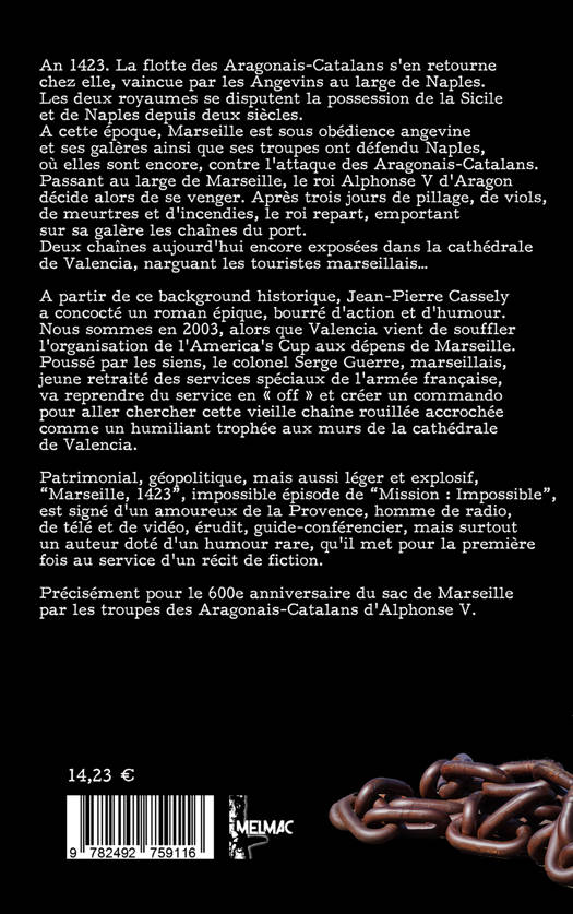 Six siècles après la mise à sac de la ville de Marseille par les forces catalo-aragonaises d'Alphonse V, un commando marseillais décide d'aller à Valence récupérer ce que les Catalans ont volé aux Marseillais : les chaînes du port.Sur un ton enlevé, entre humour et action, Jean-Pierre Cassely délivre quelques scènes quasiment hollywoodiennes dignes d'un blockbuster dans lequel un Tom Cruise à l'accent marseillais déciderait de sauver l'honneur de sa ville.