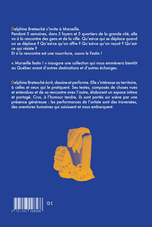 Delphine Bretesché s'invite à Marseille.<br /> Pendant 5 semaines, dans 5 foyers et 5 quartiers de la grande cité, elle va à la rencontre des gens et de la ville. Qu'est-ce qui se déplace quand on se déplace ? Qu'est-ce qu'on offre ? Qu'est-ce qu'on reçoit ? Qu'est-ce qui résiste ?<br /> Et si la rencontre est une nourriture, osons le Festin !<br /><br /> Marseille festin ! inaugure une collection qui nous emmènera bientôt au Québec avant d'autres destinations et d'autres échanges.