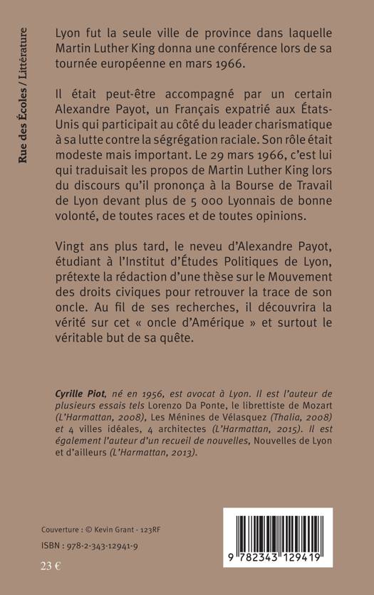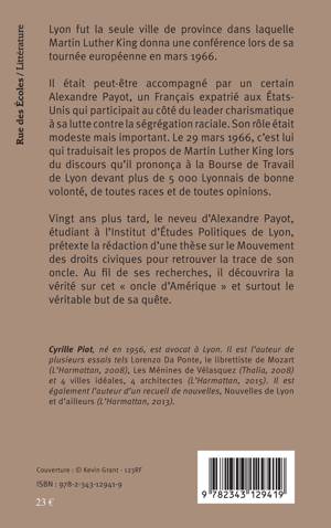 Lyon fut la seule ville de province dans laquelle Martin Luther King donna une conférence lors de sa tournée européenne en mars 1966. Il était accompagné par Alexandre Payot, un Français expatrié aux États-Unis. Son rôle était modeste mais important. C'est lui qui traduisait les propos de King lors de son discours à Lyon. Vingt ans plus tard, le neveu de Payot, décide de retrouver son oncle. Au fil de ses recherches, il découvrira la vérité sur cet "oncle d'Amérique" et surtout le véritable but de sa quête.