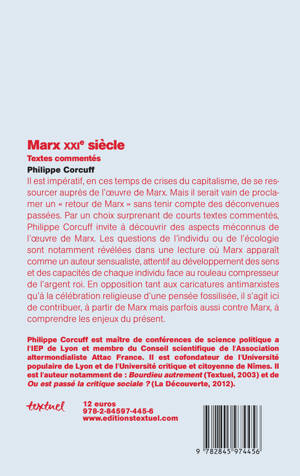 Ce livre met à disposition d'un large public de courts textes de Marx, en les éclairant à la lumière des événements contemporains. Philippe Corcuff souligne l'actualité, en ce début du XXIesiècle, de ce grand penseur critique. Il brosse le portrait d'un Marx méconnu : dans son souci de la question de l'individu ou de l'écologie, dans la critique démocratique de la bureaucratie, etc. Il n'en fait pas pour autant une icône dans une logique dogmatique, en mettant aussi en évidence ses contradictions, ses hésitations, voire ses préjugés.