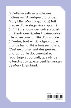 Qu'elle investisse les cirques indiens ou l'Amérique profonde, Mary Ellen Mark (1940-2015) fait preuve d'une singulière capacité à s'intégrer dans des univers aussi différents que réputés impénétrables. Elle passe avec agilité d'un monde à l'autre, tout en témoignant une grande humanité à tous ses sujets. C'est au croisement des genres, photographie documentaire, reportage et portrait, que réside la fascination qu'exercent les images de Mary Ellen Mark.
